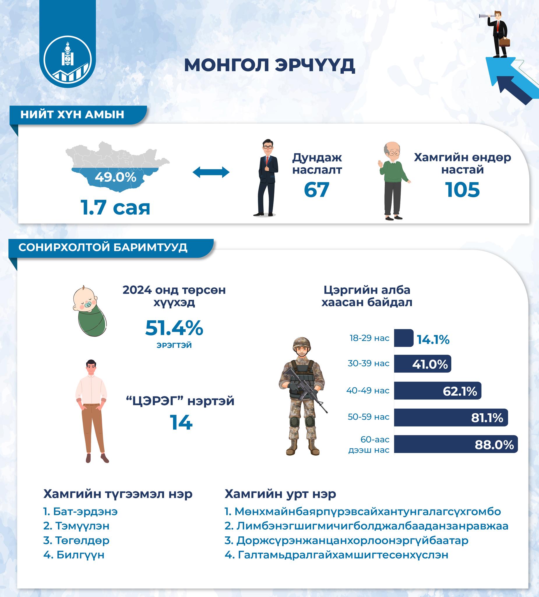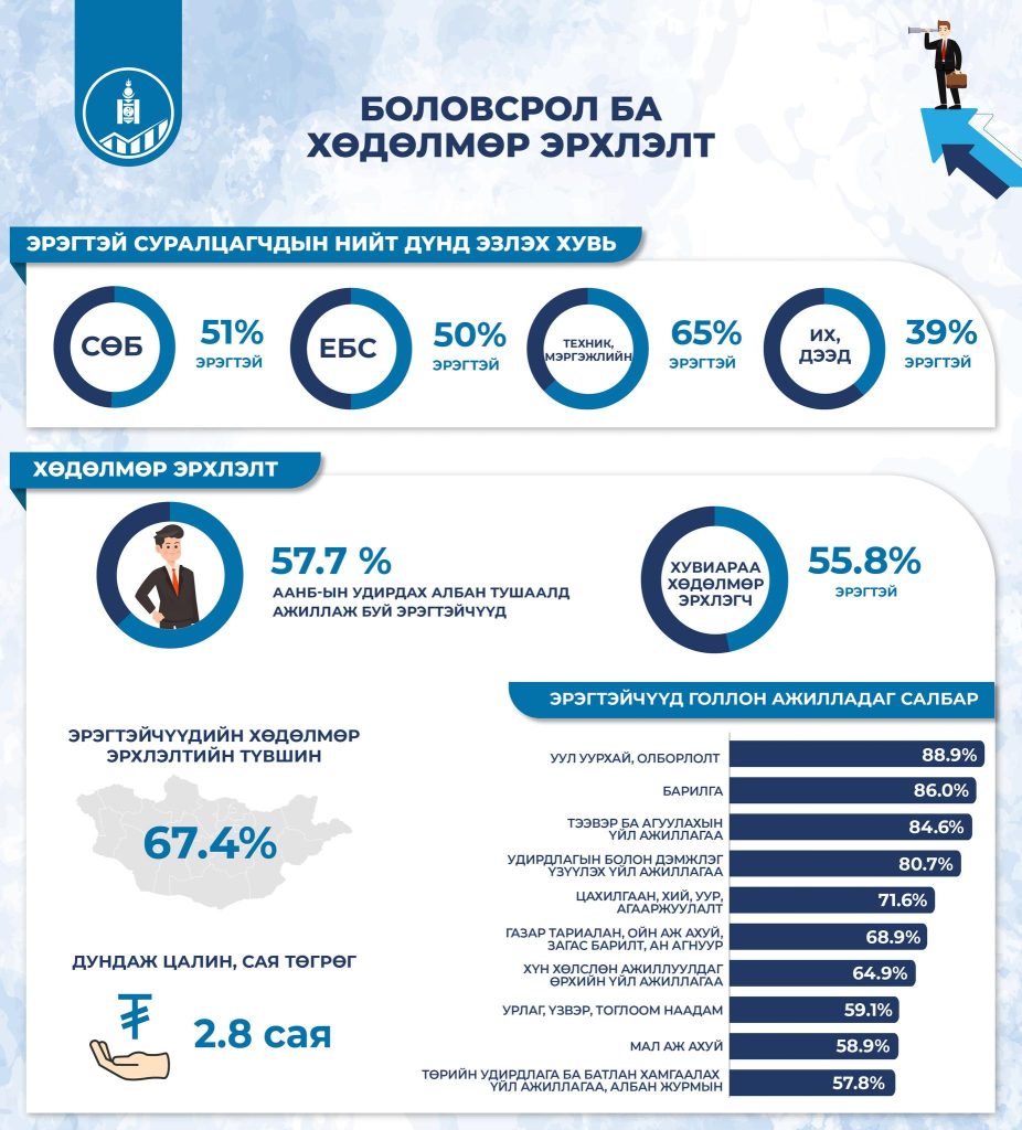 Манай улсын нийт хүн амын 49.0 хувь нь эрэгтэйчүүд. Хөдөлмөрийн насны нийт эрэгтэйчүүдийн 67.4 хувь нь ажил, хөдөлмөр эрхэлж байна. Түүнчлэн ААНБ-ын удирдах албан тушаалд ажиллаж буй нийт ажиллагчдын 57.7 хувь нь эрэгтэйчүүд байна.