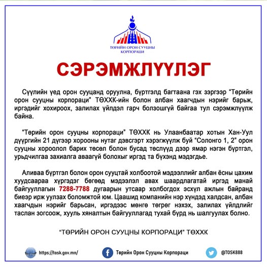 “Орон сууцанд оруулна, бүртгэлд багтаана” гэх зэргээр “Төрийн орон сууцны корпораци” ТӨХХК-ийн болон албан хаагчдын нэрийг барьж, иргэдийг хохироох, залилах үйлдэл гарч байгаа талаар тус компаниас мэдээллээ. Тодруулбал, “Төрийн орон сууцны корпораци” ТӨХХК нь нийслэлийн Хан-Уул дүүргийн 21 дүгээр хорооны нутаг дэвсгэрт хэрэгжүүлж буй “Солонго 1, 2” орон сууцны хороолол барих төсөл болон бусад төслүүд дээр ямар нэгэн бүртгэл, урьдчилгаа захиалга аваагүй болохыг мэдэгджээ.