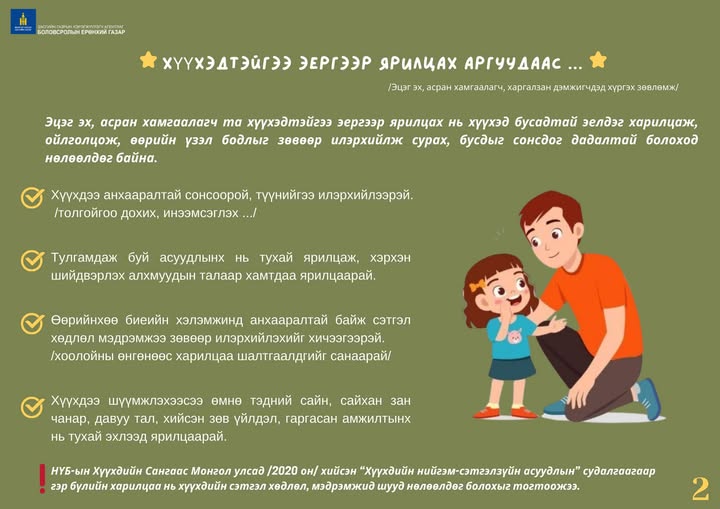 Эцэг эх, асран хамгаалагч та хүүхэдтэйгээ эергээр ярилцах нь хүүхэд бусадтай эелдэг харилцаж, ойлголцож, өөрийн үзэл бодлыг зөвөөр илэрхийлж сурах, бусдыг сонсдог дадалтай болоход нөлөөлдөг байна.