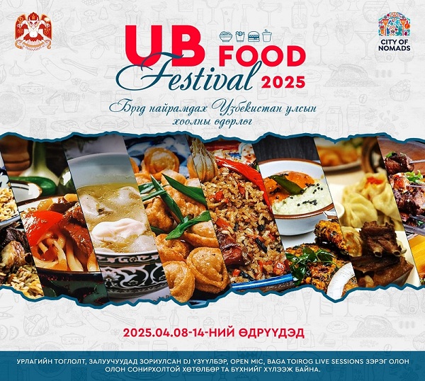 Энэ жилийн аялал жуулчлалын улирлыг эхлүүлж, дөрөвдүгээр сарын хоёр дахь долоо хоногт үндэсний болон олон орны хоолны соёлыг иргэд, жуулчдад таниулах “UB food” фестивалийг нийслэлийн Засаг даргын Тамгын газраас санаачлан зохион байгуулж байна. “UB food” фестиваль энэ сарын 8-14-ний өдрүүдэд Сүхбаатарын талбайд болно. Энэ удаагийн фестивалиар Бүгд найрамдах Узбекистан улсын хоолны амт, соёлыг онцлохын зэрэгцээ Монголын бурхан шашинтны төв Гандантэгчинлэн хийдийн лам нар нэг тонн хэмжээтэй ширмэн тогоонд гурилтай шөлийг уламжлалт аргаар бэлтгэж, монгол хоолны соёлыг түгээх юм.