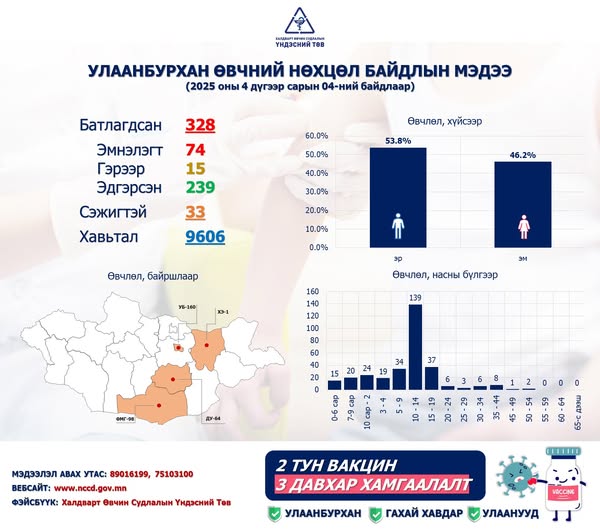 2025.04.04-ний өдрийн байдлаар улаанбурхан өвчний лабораториороор батлагдсан тохиолдол 328 болж, өмнөх өдрөөс даруй 75 тохиолдлоор нэмэгдлээ.