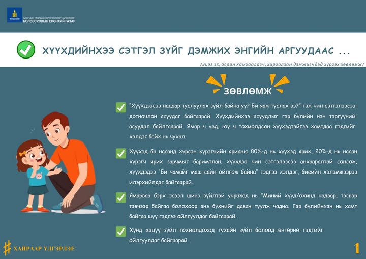 Хүүхэд ба насанд хүрсэн хүрэгчийн ярианы 80%-д нь хүүхэд ярих, 20%-д нь насан хүрэгч ярих зарчмыг баримтлан, хүүхдээ чин сэтгэлээсээ анхааралтай сонсож, хүүхдэдээ “Би чамайг маш сайн ойлгож байна” гэдгээ хэлдэг, биеийн хэлэмжээрээ илэрхийлдэг байгаарай.