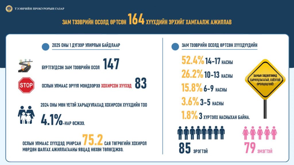 Тээврийн прокурорын газраас нийслэлийн төвийн 6 дүүргийн хэмжээнд зам тээврийн ослын улмаас хүүхэд хохирсон хэргийг 2025 оны 1 дүгээр улирлын байдлаар судалжээ.