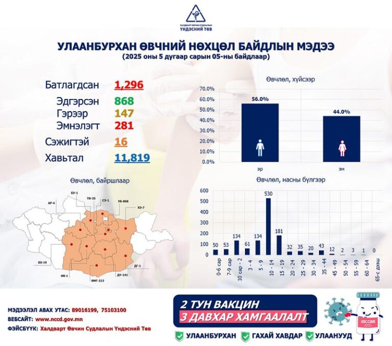 Халдварт өвчин судлалын үндэсний төвөөс Улаанбурхан өвчний нөхцөл байдлын талаар мэдээлэл өглөө. Өнөөдөр буюу 2025 оны тавдугаар сарын 5-ны байдлаар нийт улаанбурхан өвчний лабораториор батлагдсан 1296, эмнэлэгт хэвтэн эмчлүүлж байгаа 281, гэрээр 115, эдгэрсэн 868, сэжигтэй тохиолдол 16, Хавьтал 11819 байгаа аж.