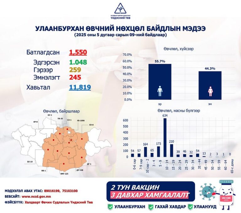 Өнөөдөр буюу 2025 оны тавдугаар сарын 09-ний байдлаар нийт улаанбурхан өвчний лабораториор батлагдсан 1550, эмнэлэгт хэвтэн эмчлүүлж байгаа 245, гэрээр 259, эдгэрсэн 1048, Хавьтал 11819 байгаа аж.