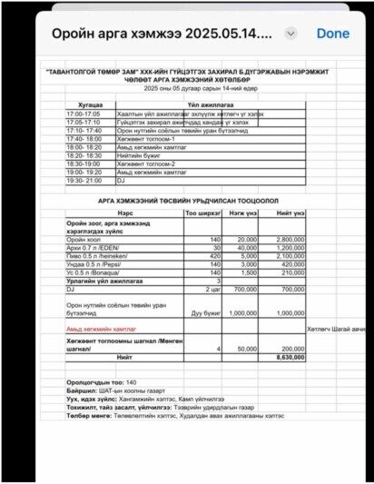 Энэхүү арга хэмжээнд 140 хүн оролцож, ганц оройн зугаа цэнгэлд Eden гэгч цагаан архи 30 шилийг нэг сая 200 мянган төгрөгөөр хөнтрөхөөр төлөвлөж. Мөн Heineken шар айргийг хоёр сая 100 мянган төгрөгөөр уунаа л гэж байна.