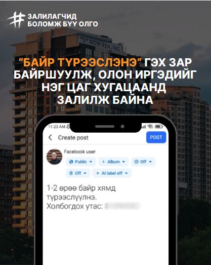 Энэ сарын 05-07-ны өдрийн хооронд Дархан-Уул аймгийн зарын нэгдсэн группт Бат-Оргил гэх хаягаас “Байр хямд үнээр түрээслэн” гэх зар мэдээллийг байршуулж, нийт 3 иргэнээс 9,400,000 төгрөг авч, залилсан гэх үйлдлийг тус аймгийн цагдаагийн газраас шалгаж байна.