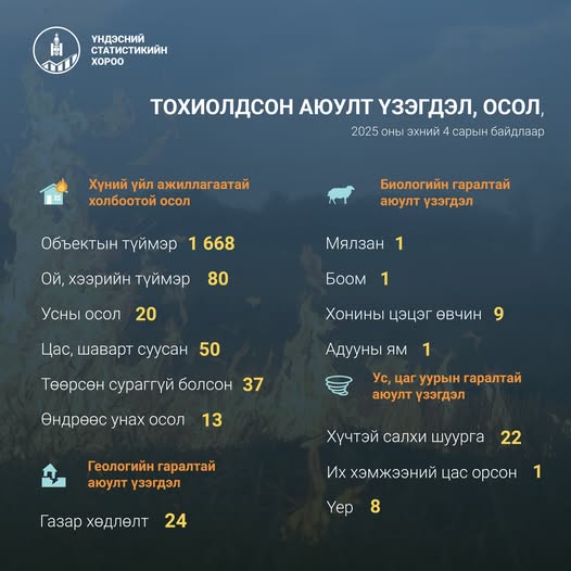 Объектын түймэр 2025 оны эхний 4 сард 1668 удаа бүртгэгджээ. Аюулт үзэгдэл, ослын тохиолдол 2025 оны эхний 4 сард 2019 удаа бүртгэгдэж, өмнөх оны мөн үеэс 129 (6.8%) -аар буурсан байна.