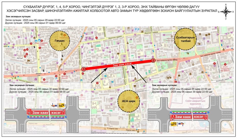 Энхтайваны өргөн чөлөөний засвар, шинэчлэлтийн ажлын хүрээнд 11 дүгээр сургуулийн уулзвараас Цэцэг төвийн уулзвар хүртэлх авто замыг хэсэгчлэн хааж, шинэчилнэ. Тодруулбал, авто замын урд эгнээг тавдугаар сарын 29-ний 22:00 цагаас хааж, 30-ны 22:00 цагт нээнэ.