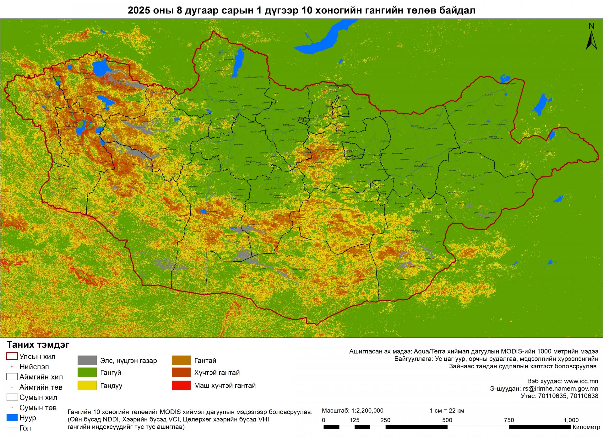 Үнэлгээгээр наймдугаар сарынн 10-ны өдрийн байдлаар Баян-Өлгий, Увс, Ховд, Завхан, Говь-Алтай, Дундговийн ихэнх, Баянхонгор, Өвөрхангай, Төв, Дорноговийн зарим, Сэлэнгэ, Дархан-Уул, Дорнод, Сүхбаатарын цөөн сумдын нутгаар гандуу болон гантай байна.