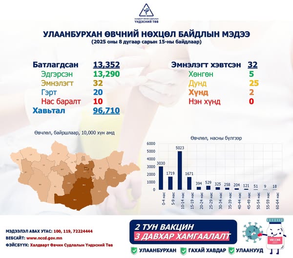 Халдварт өвчин судлалын үндэсний төвийн гаргасан мэдээллээр, 2025.08.15-ны өдрийн байдлаар улаанбурхан өвчний нийт батлагдсан тохиолдол 13,352 болсон байна.
