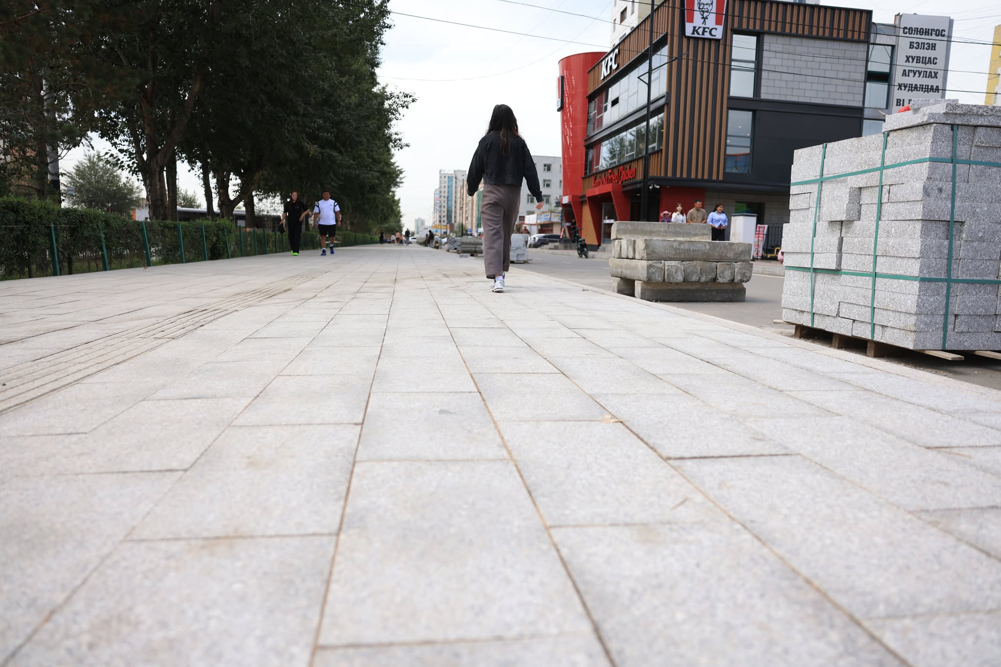 Хархорины гүүрнээс 32 дугаар байр хүртэлх хэсэгт явган хүний замын ажилд ашиглаж буй чулууг Баянзүрх дүүргийн 11 дүгээр хороо Хонхорт байрлалтай “Үүдэнчулуу” ХХК-иас авч, суурилуулж байгаа аж. Нийт 3500 ам.метр чулуу авсан. Өнөөдрийн байдлаар 3490 ам.метр чулуугаар явган хүний замыг хийж дуусгажээ. Уг чулуун замыг стандартын дагуу, явган хүн зорчиход хүртээмжтэйгээр дөрвөн метр өргөн хийж, хөгжлийн бэрхшээлтэй иргэнд зориулж хөтөч хавтанг ч хийж байгааг гүйцэтгэгч компанийн зүгээс хэллээ.