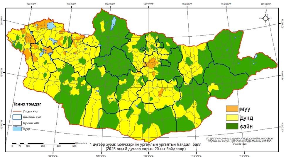 Ус цаг уур, орчны судалгаа мэдээллийн хүрээлэнгээс гаргасан бэлчээрийн ургамлын ургалтын байдал наймдугаар сарын 20-ны байдлаар нийт нутгийн 46 хувьд гантай болон гандуу, 54 хувьд хэвийн байна.