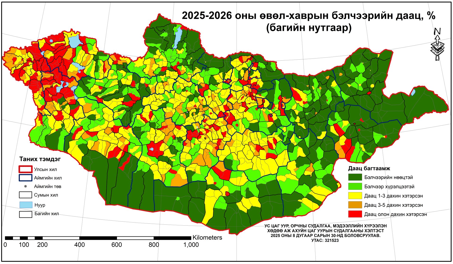 Ус цаг уур судалгаа мэдээллийн хүрээлэнгээс Засгийн газрын 286 дугаар тогтоолын дагуу 2025-2026 оны өвөл, хаврын бэлчээрийн даацыг баг бүрийн бэлчээрийн ургац, малын тоо, бэлчээрийн талбайн хэмжээ, бэлчээр ашиглах хугацаа зэрэг мэдээлэлд үндэслэн багийн нутгаар тооцоолон гаргасан байна. Зуншлагын байдал наймдугаар сарын 20-ны байдлаар нийт нутгийн 54 хувьд хэвийн, нутгийн 46 хувьд гантай болон гандуу байгаа бөгөөд: