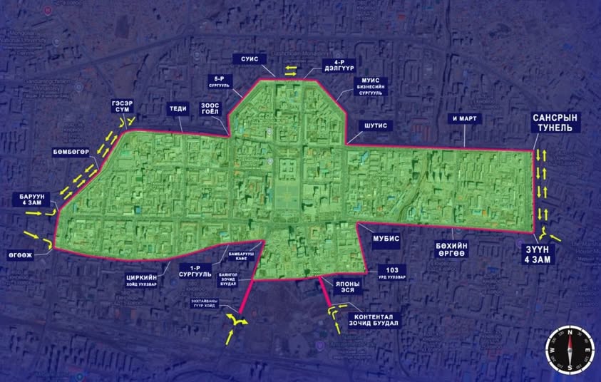 Энэ өдөр Сүхбаатарын талбай (Д.Сүхбаатарын гудамж, Их сургуулийн гудамж), Сөүлийн гудамж, Партизаны гудамж, “Бөмбөгөр” худалдааны төвийн уулзвар, Төмөрчний гудамж, Гэсэр сүмийн уулзвар, Самбуугийн гудамж, Анкарагийн гудамж, Бага тойруу, Бээжингийн гудамж, Токиогийн гудамж, Сансарын туслах замаар Энхтайваны өргөн чөлөөний Зүүн 4 замын уулзвараас Баруун 4 замын уулзвар, Чагдаржавын гудамж, Элчингийн гудамж, Олимпын гудамж, Гэндэнгийн гудамж, Чингисийн өргөн чөлөөний Монголын хүүхдийн ордны уулзвараас “Монгол шуудан”-гийн уулзвар болон дотогш замуудын автомашины хөдөлгөөнийг хязгаарладаг.