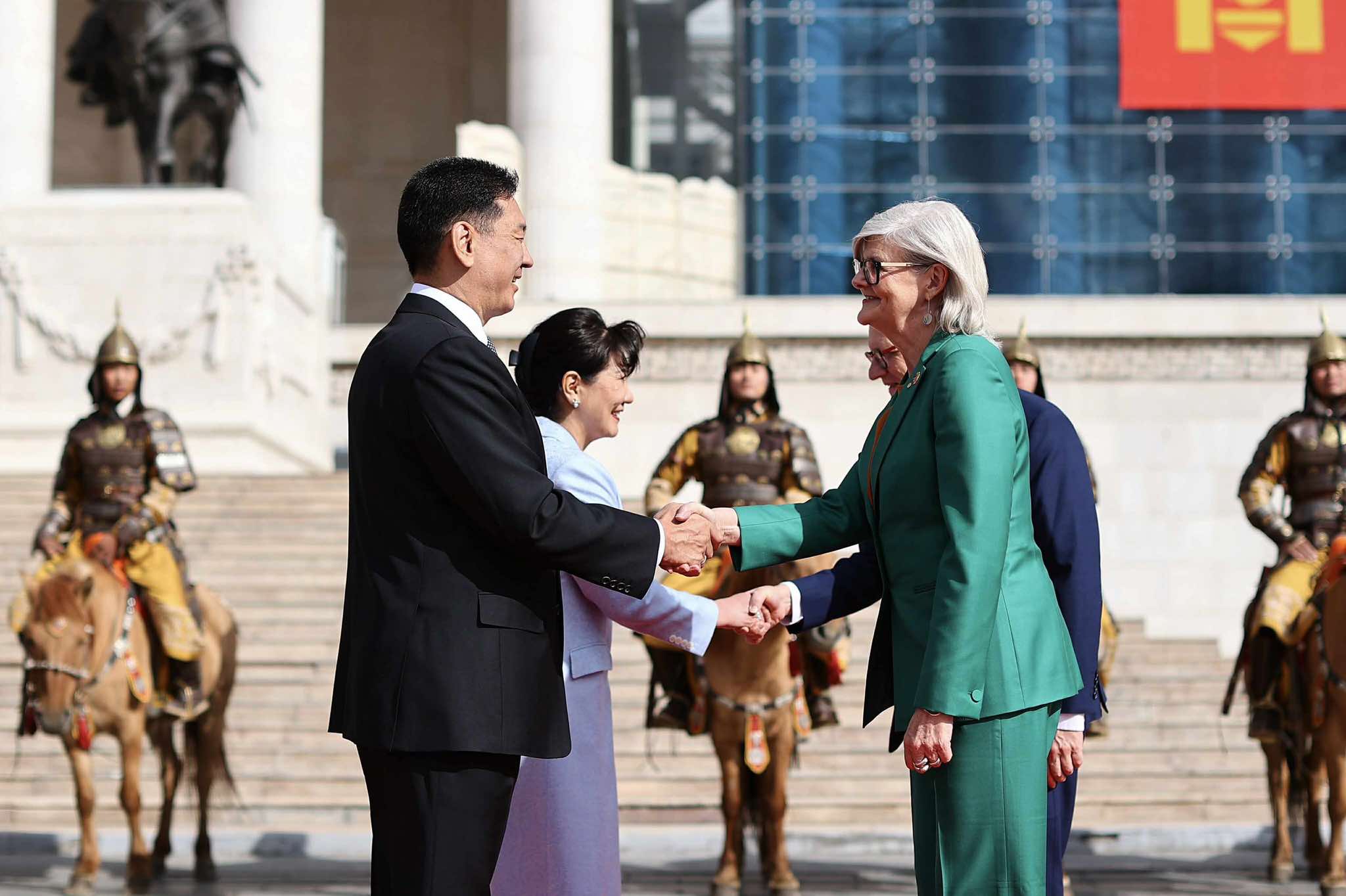 Монгол Улсын Ерөнхийлөгч У.Хүрэлсүх гэргий Л.Болорцэцэгийн хамт Австралийн Холбооны Улсын Амбан захирагч Саманта Мостин, нөхөр Симеон Бэкэтт нарыг жанжин Д.Сүхбаатарын талбайд албан ёсоор угтан авлаа.
