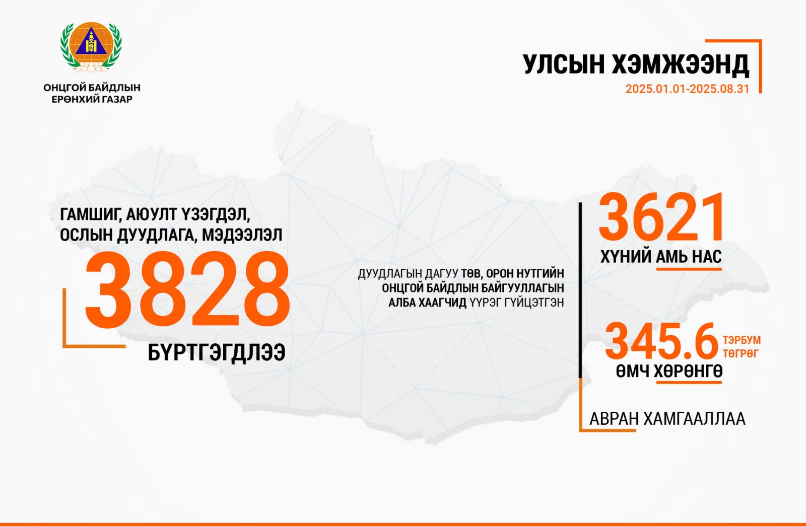 Улсын хэмжээнд он гарсаар найман сарын байдлаар 3828 удаагийн гамшиг, аюулт үзэгдэл, ослын дуудлага, мэдээлэл бүртгэгдлээ.