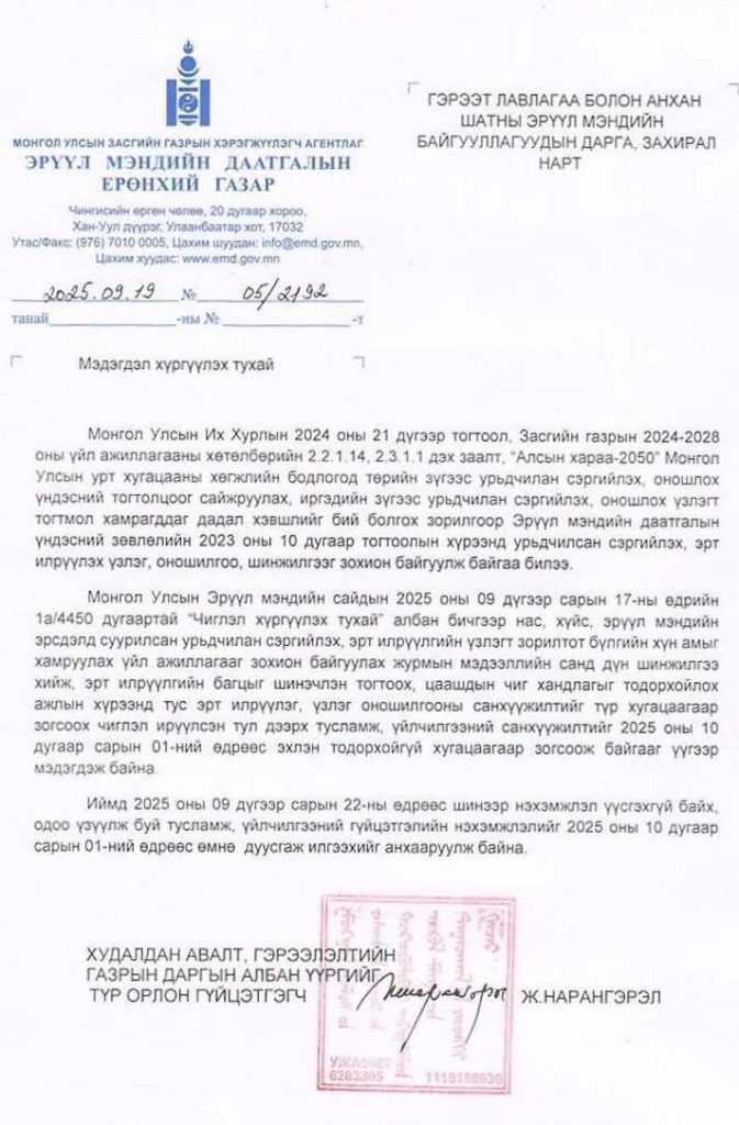 Эрүүл мэндийн даатгалын ерөнхий газраас эмнэлгийн байгууллагуудад албан бичиг хүргүүлжээ. Албан бичгийн агуулга нь эрт илрүүлэг үзлэгийг тодорхойгүй хугацаанд зогсоох тухай.