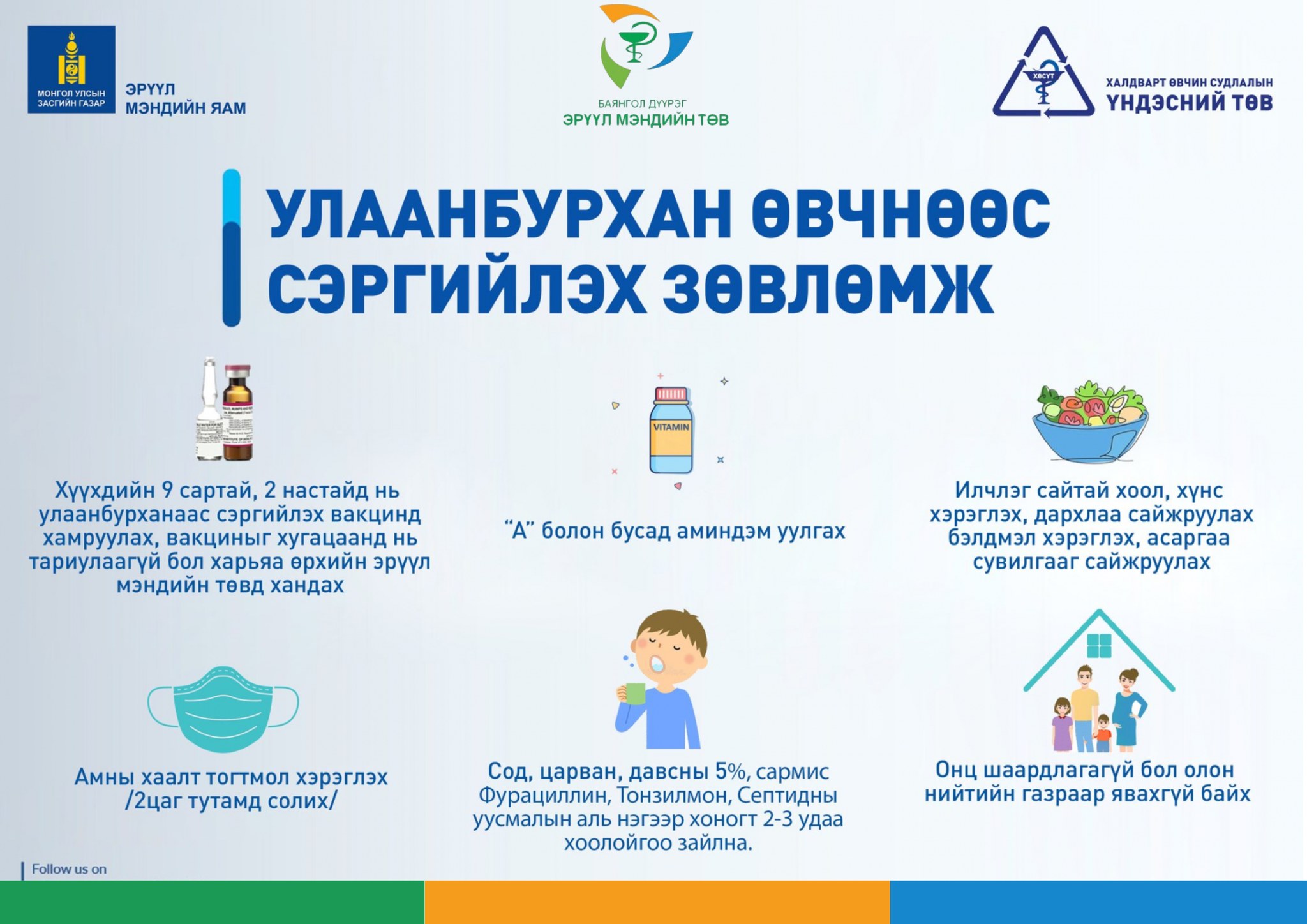 • Улаанбурхан, гахай хавдар, улаанууд өвчний эсрэг /УГУ/ вакциныг 9 сар, 2 настайд товлолын дагуу хийлгээрэй.