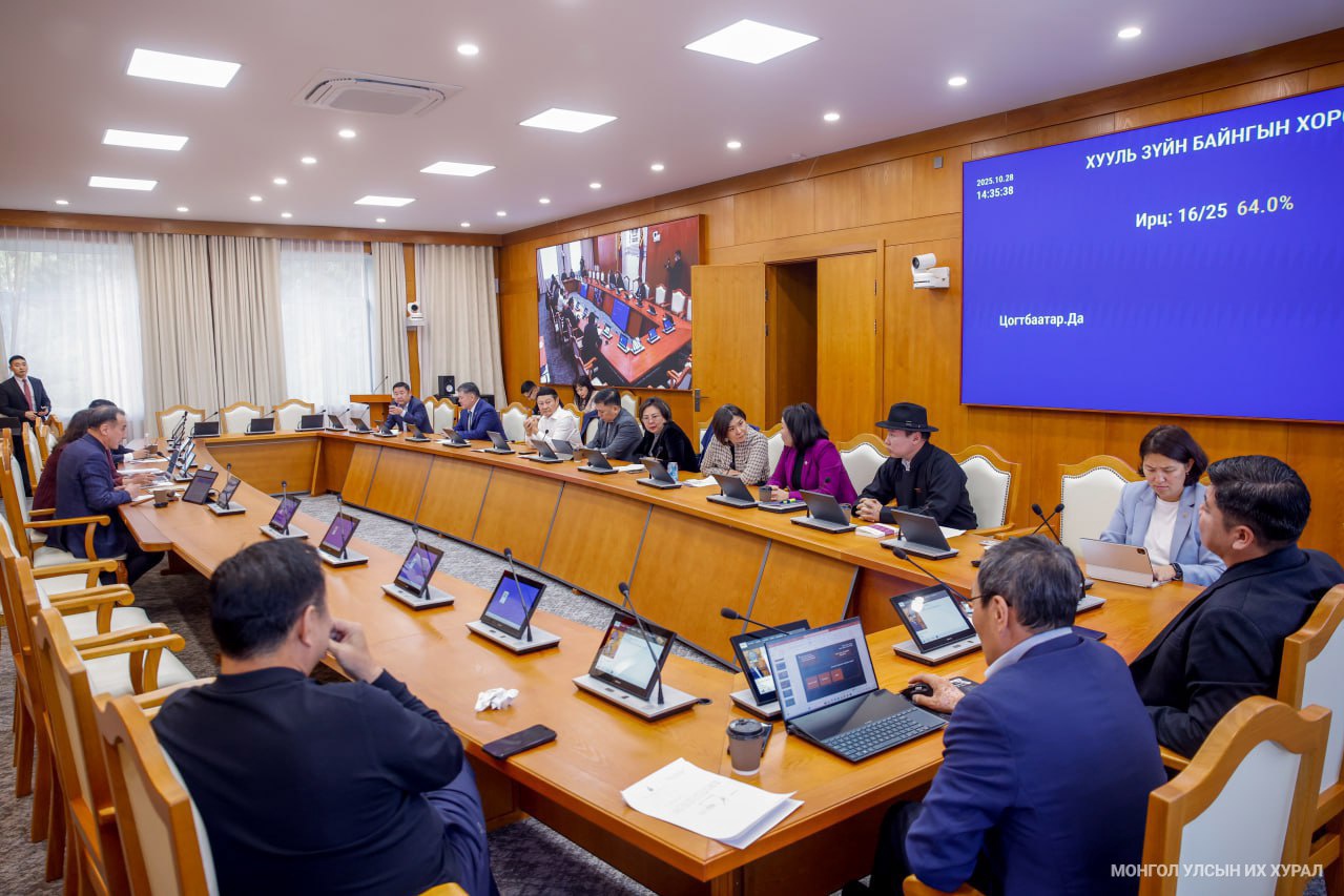 Хууль зүйн байнгын хорооны өнөөдрийн (2025.10.28) хуралдаан 14 цаг 23 минутад гишүүдийн 56 хувийн ирцтэй эхэлж, “Тогтоолд нэмэлт оруулах тухай” Байнгын хорооны тогтоолын төслийг хэлэлцэн баталлаа. Байнгын хорооны 2025 оны 10 дугаар сарын 15, 17-ны өдрийн хуралдаанаар Шүүхийн ерөнхий зөвлөлийн шүүгч бус гишүүнийг сонгон шалгаруулах ажлын хэсгийг байгуулах асуудлыг хэлэлцсэн. Шүүхийн ерөнхий зөвлөлийн шүүгч бус гишүүнийг сонгон шалгаруулах ажлын хэсгийн бүрэлдэхүүнд Засгийн газраас санал болгосон төлөөллийг хуралдаанд оролцсон гишүүдийн олонх дэмжээгүй юм. Энэ тохиолдолд тухайн байгууллага ажлын хоёр өдрийн дотор өөр хүний нэрийг Байнгын хороонд ирүүлэх зохицуулалттай байдаг. Засгийн газраас Шүүхийн ерөнхий зөвлөлийн шүүгч бус гишүүнийг сонгон шалгаруулах ажлын хэсгийн бүрэлдэхүүнд Н.Мягмарыг томилуулахаар албан бичиг ирүүлсэн болохыг Д.Цогтбаатар дарга танилцуулав.