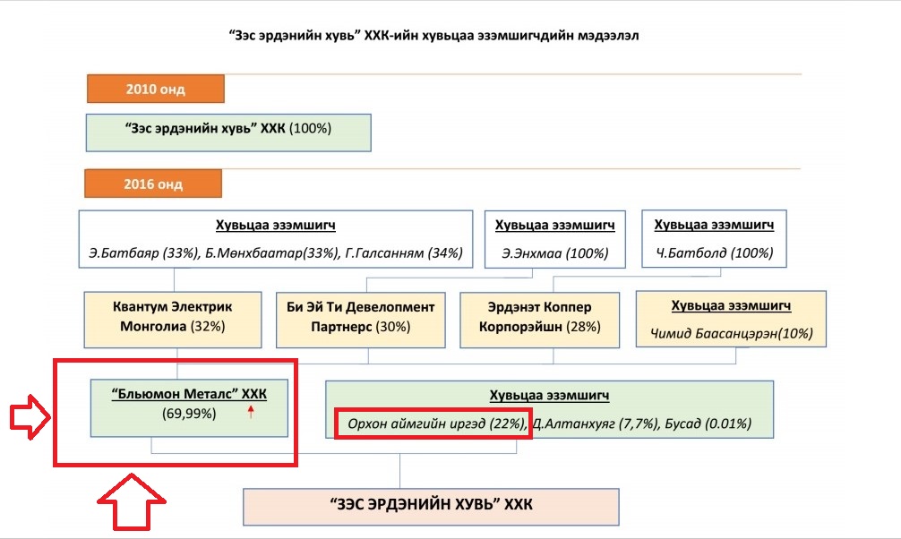 Ингэхдээ “Бьлюмон Металс” гэрээний дагуу үйлдвэрээ барьсаны дараа 50 хувийг эзэмших ёстой атал үйлдвэрээ бариагүй байж “Зэс эрдэнийн хувь” ХХК-ийн 70%-ийг эзэмшчихжээ. Энэ бүхний цаана “Зэс эрдэнийн хувь” ХХК-иын Гүйцэтгэх захирал Д.Алтанхуяг холбоотой гэж хэлж болно.