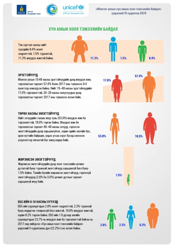 Монгол Улсад 15-49 насны эрэгтэйчүүдийн 57.4 хувь нь илүүдэл жин, таргалалттай, нөхөн үржихүйн насны эмэгтэйчүүдийн 53 хувь нь илүүдэл жин, таргалалттай, ЕБС-ийн сурагчдын 23.7 хувь нь илүүдэл жин, таргалалттай гэсэн судалгаа байна.