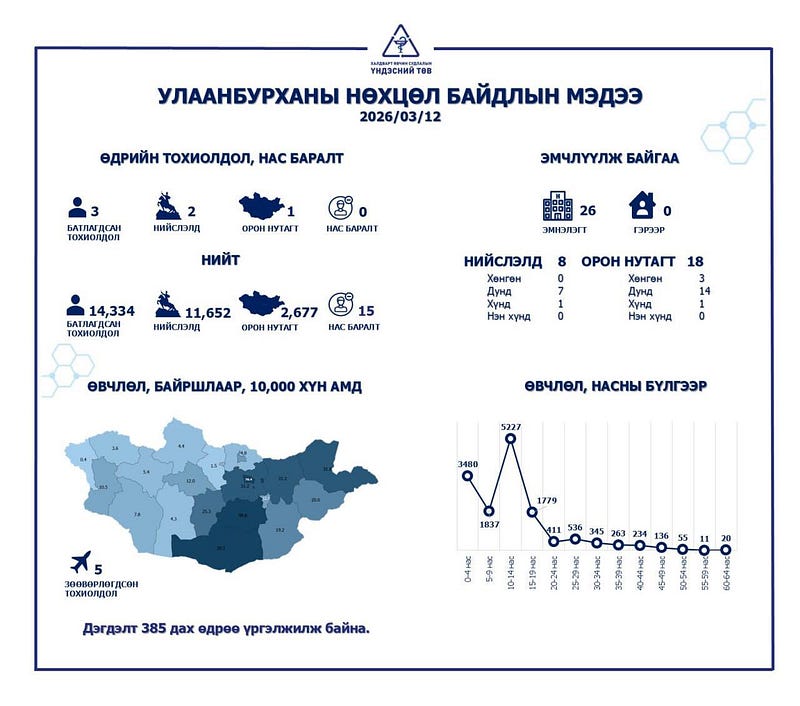 Улаанбурхан өвчний батлагдсан тохиолдол улсын хэмжээнд 14.334 хүрээд байгаа бөгөөд нийслэлд 11652, орон нутагт 2677 бүртгэгдсэн байна. Халдварт өвчин судлалын үндэсний төвөөс гаргасан 2026 оны гуравдугаар сарын 12-ны мэдээллээр Улаанбурхан өвчний батлагдсан тохиолдол 3 нэмэгджээ. Одоогийн байдлаар эмнэлэгт 26 хүн хэвтэн эмчлүүлж байгаа.