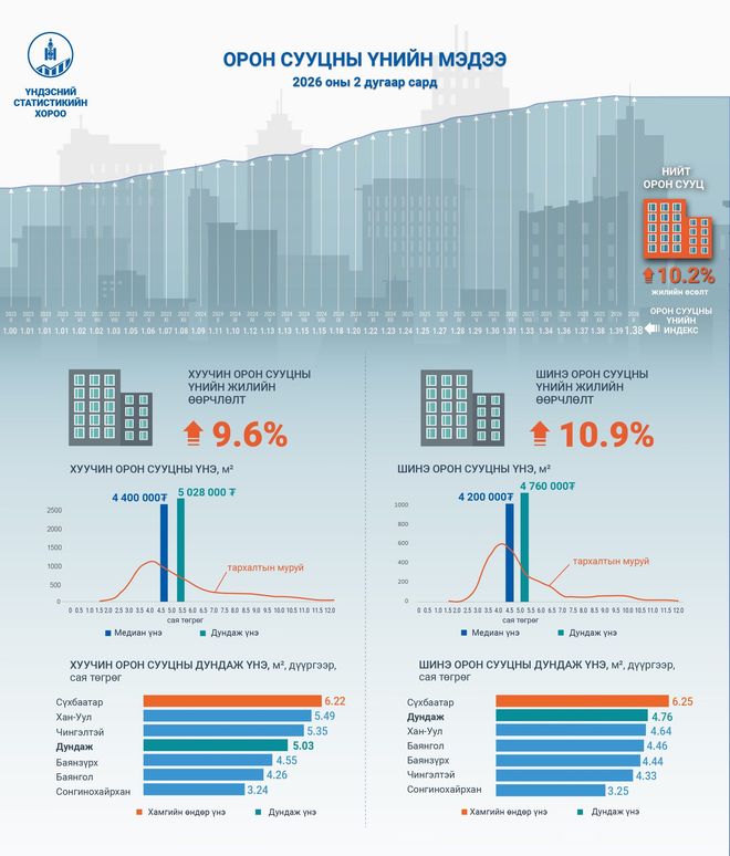 Орон сууцны үнийн индекс 2026 оны хоёрдугаар сард 1.38 болж, өмнөх оны мөн үеэс 10.2 хувиар өсөж, өмнөх сараас 1.1 хувиар буурсан байна.