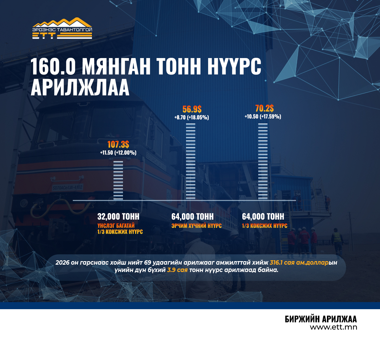 “Эрдэнэс Тавантолгой” ХК 2026 оны 03 дугаар сарын 23-ны өдөр Монголын Хөрөнгийн Биржээр дамжуулан 3 удаагийн амжилттай арилжаагаар 160.0 мянган тонн нүүрсийг нийт 11.6 сая ам.долларын үнийн дүнтэйгээр БНХАУ-ын боомт хүргэж өгөх нөхцөлөөр арилжааллаа.