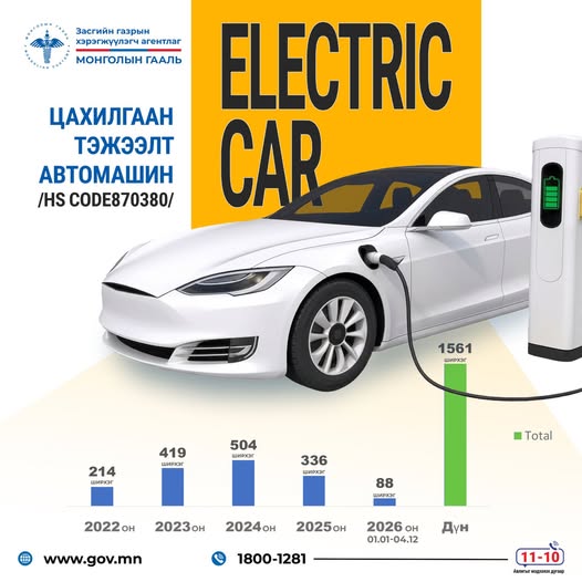 2026 оны эхнээс 4 дүгээр сарын 12-ны өдрийн байдлаар 88 ширхэг, 1.6 сая ам.долларын цахилгаан автомашин импортлогджээ.