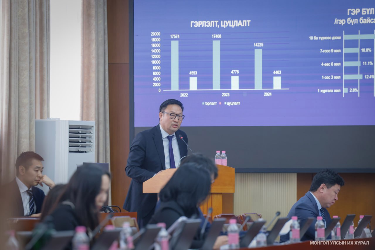 Хувийн эрх зүйн асуудлыг зохицуулдаг суурь хуулиудын нэг нь Гэр бүлийн тухай хууль бөгөөд уг хуулийг 1999 онд баталж, 8 удаа нэмэлт, өөрчлөлт оруулсан. Гэвч гэрлэх, гэрлэлт цуцлах, хүүхдийн эрх, хууль ёсны эрх ашиг хөндөгдөх, зөрчигдөх, сэргээх зэрэг харилцааг нарийвчлан зохицуулаагүй явж ирсэн учраас Гэр бүлийн тухай хуулийн шинэчилсэн найруулгын төслийг боловсруулан өргөн барьсан тухай Хууль зүй, дотоод хэргийн яамнаас танилцууллаа.