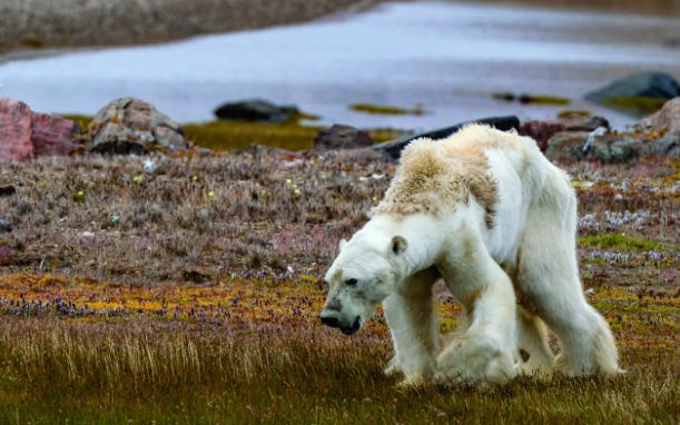 Хойд Канадын Баффины арлууд дахь эзэнгүй ан агнуурын хуаранд гэрэл зурагчин Кристина Миттермайер, Пол Никлен нар цагаан баавгай сүүлийн алхмаа хийж байхыг харжээ. Баавгай арай хийн хөлөө чирч алхан хүнс хайсан.