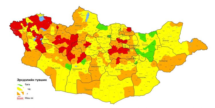 Улсын хэмжээнд зудын эрсдэлийн ерөнхий үнэлгээг хийхэд эрсдэлийн түвшин “дунд” үүнээс Баян-Өлгий, Завхан, Увс “маш их” эрсдэлтэй байна.