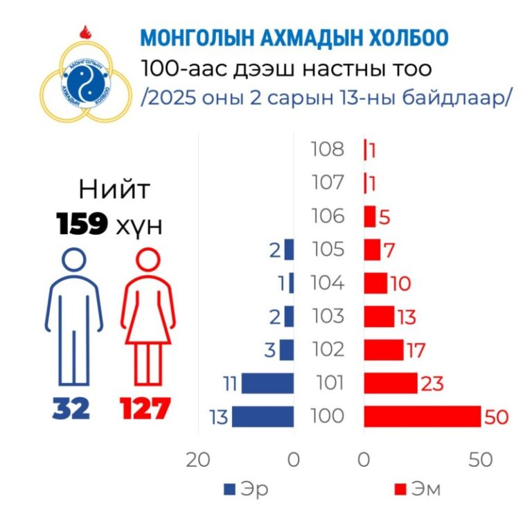 2025 оны хоёрдугаар сарын 17-ны өдрийн байдлаар Монгол Улсад 100 болон түүнээс дээш насны нийт 159 иргэн бүртгэлтэй байна.