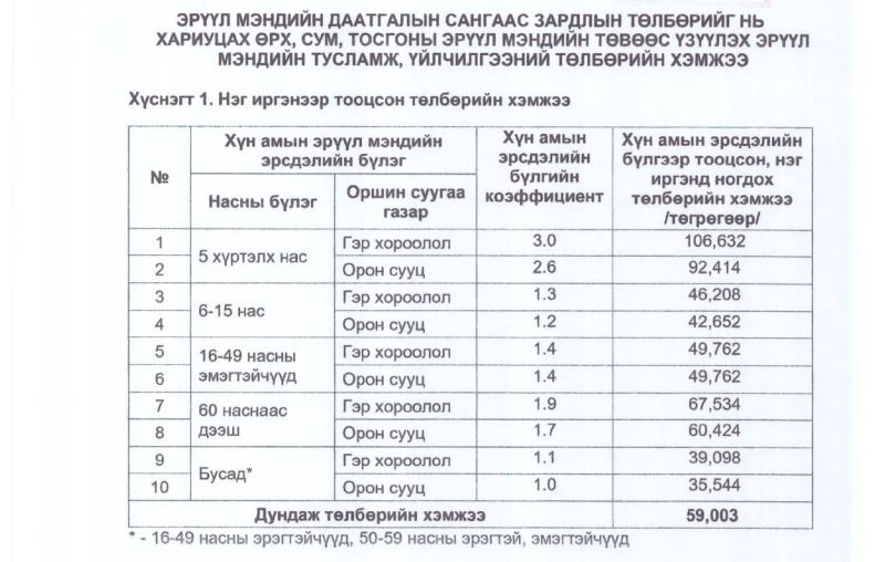 Эрүүл мэндийн даатгалын сангаас санхүүжих төлбөрийн хэмжээ, шинэчилсэн журамтай дэлгэрэнгүй танилцах бол энд дарна уу. Ирэх дөрөвдүгээр сард хөдөлмөрийн хөлсний доод 792 мянган төгрөг болсноор сард 15840 төгрөг эрүүл мэндийн даатгалын шимтгэлд төлөх юм.